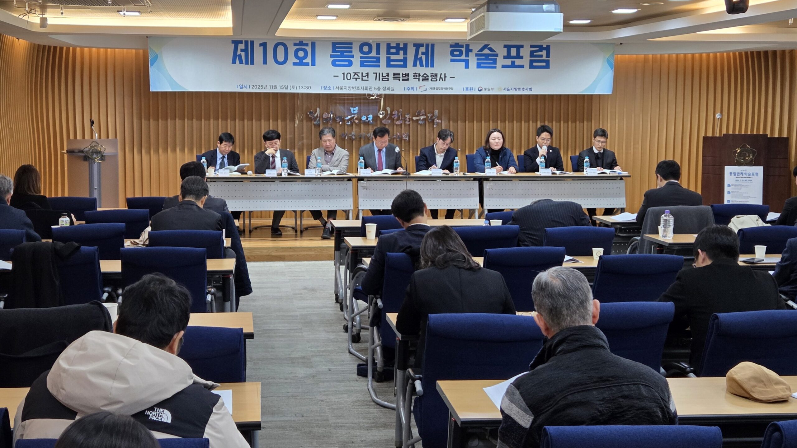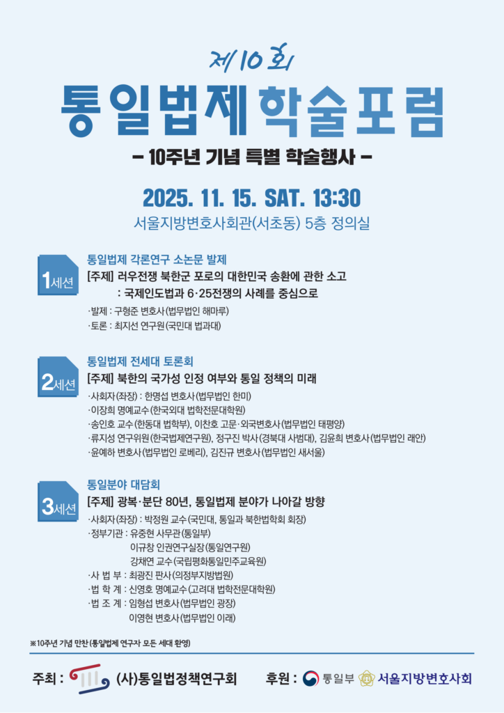 통일법정책연구회는 2025. 11. 15. 토요일 오후 1시 30분 서울지방변호사회관 5층 정의실에서 제10회 통일법제 학술포럼을 10주년 기념 특별행사로 기획하여 개최하였습니다.